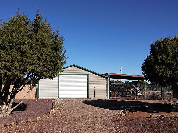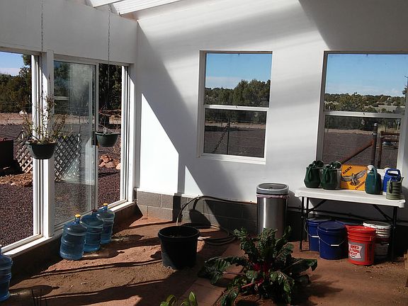 Nestled in the White Mountains of Northern Arizona, this 3 bedroom, 1 office, 2 ½ bath home sits atop a hill covered by 43 acres of Juniper woodland with panoramic views of surrounding White Mountain beauty. This property boasts two small wine vineyards, an attached frame-built greenhouse, outdoor garden, solar/wind energy with a backup diesel generator, and a private well with a 3,000 gallon storage tank and pressure pump system drawing directly from Arizona's largest groundwater basin. Heat is provided by a propane forced air system throughout the home in addition to a wood burning stove in the main living area. The property also hosts a detached two car garage with attached double car port, gated driveway, spacious garden patio with fire pit, covered rear and front decks, enclosed chicken yard with coop, and ample fencing surrounding the entire 43 acre property that also separates various areas within the property. Since 2008, the total cost of improvements and upgrades to the solar power system and exterior of the property exceeds $90,000. The inside of this Schult-manufactured triple wide includes an office with built-in desks, octagonal dining room space, island and bar counters in the kitchen, three bay windows (kitchen, master bedroom, and bedroom), Jack & Jill bathroom between the second and third bedrooms, and a separate Roman bathtub and walk-in shower in the master bathroom. Other features include a laundry room, walk-in closet in the master bedroom, and kitchen pantry. Note: Although this home is totally off the grid and power for the home is provided by a combination of solar,wind, and diesel generator, the local electric company previously installed a line/pole within a couple hundred feet of this home and connecting to this line to access grid power is a potential option in the future for anyone who chooses to do so.