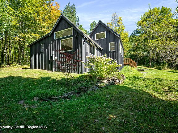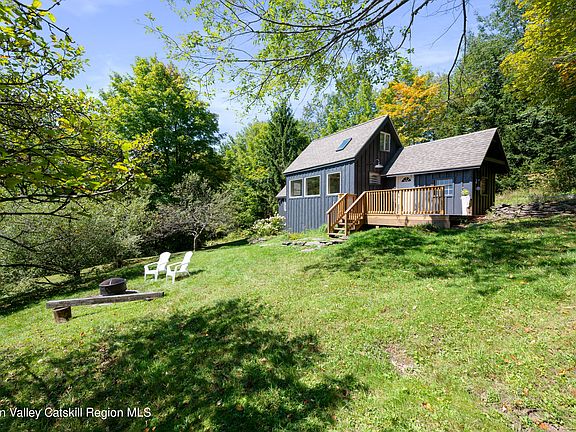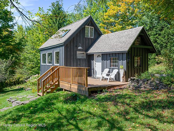 Discover your own slice of paradise with this artist's cabin retreat, offering breathtaking mountain views right in the heart of the Catskills. Accessed via a private road and nestled on 5.25 private acres of lush woods, seasonal creeks, and apple trees, this enchanting 986 sqft. home is a haven of peace and creativity. Inside, you'll find a cozy 1-bedroom layout with a versatile loft space, a stylishly updated bathroom, and a spacious open floor plan that seamlessly integrates living, kitchen, and dining areas.