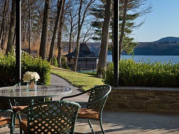 This grand residence is located in the Historic area of Rhinebeck and is sited high above the Hudson River with unobstructed Catskill Mountain views. Secluded on twelve curated and landscaped acres, the house is approached via a lighted half-mile drive over a stone bridge into the private courtyard. Architect Michael Oxman designed this modern home with pitched copper roofs as a tribute to the Country French style. Open concept living integrated with private rooms makes this three-story sun-filled home welcoming and comfortable. The expansive Great Room features an 'uber' gourmet kitchen, living room with floor-to-ceiling windows and bluestone fireplace, a glass enclosed breakfast room with deck access and panoramic Western views from every angle. The first floor master bedroom suite includes a spacious bedroom, luxurious bath and a private library. The second floor with private balcony and loft offers a family room and two en suite bedrooms each with an alcove giving you a breathtaking view of the river and mountains. In addition, this home boasts an 1800sf ground floor comprising a spacious living room with fireplace, a media/guestroom, a gym with kitchenette and full bath and a beautiful bluestone patio with views of the Esopus Lighthouse. The private guest/caretaker legal apartment and house elevator enhance the ease of this grand residence. At the property's edge, within established Japanese gardens, is a replica of a bamboo Tea House. Extensive decking embraces the pool and offers yet another breathtaking panoramic view. A Rhinebeck Hudson River Estate with scenic views and sunsets from every floor and every room....Features of this home: Great Room expanse is over 60 feet with 10 foot ceilings. Private formal dining room seats 14+. Custom cherry built-ins throughout the house including the kitchen with its honed limestone counter tops, double islands and professional appliances. Red oak flooring throughout the house. A half moon patio, tropical ipe deck or private balcony on every floor. Western exposure. A private office with separate entrance. Additional living/entertaining space in the finished ground floor. A custom elevator fits 4 and reaches all 3 floors. Japanese bamboo Tea house is used as a pool house and has a half bath.