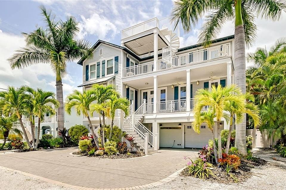 Perfect residence or rental w 5 bedrooms, plenty of parking! Offered 'Turnkey', move-in ready for your adventures on world famous Anna Maria Island! Like new home just a short walk from local boutiques, restaurants & the Gulf Beaches. Extended garage for 4 cars with an extra-large driveway for guest parking. Ground floor foyer with extra storage rooms opens to the back yard pool & covered lounge lush with tropical foliage, plus an outdoor full shower to rinse off after sandy beach days. Take the stairs or elevator to the main floor open kitchen/great room, with walk around deck & screened porch. This Gourmet Kitchen features wine refrigerator, separate ice maker, plenty of beachy white cabinets, a large closet pantry & a propane Wolf Range to show off your entertaining skills. Overlooking the pool, the main floor Master Suite includes a bath with enormous walk-in shower, walk-in closet and bonus closet. Upstairs, find 2 large bedrooms with a full hall bath plus 2 additional Jack 'n Jill guest rooms with full bath. Smart planning by these original owners includes a washer & dryer for each floor. Bring wine for a breathtaking sunset experience on the upper deck or even better, take the spiral staircase to the roof top deck with a magnificent 360 degree view of the Gulf of Mexico & Tampa Bay kissing the shores of Anna Maria Island. It's always a good time to own property in Paradise! Call today for a showing of this awesome island home!