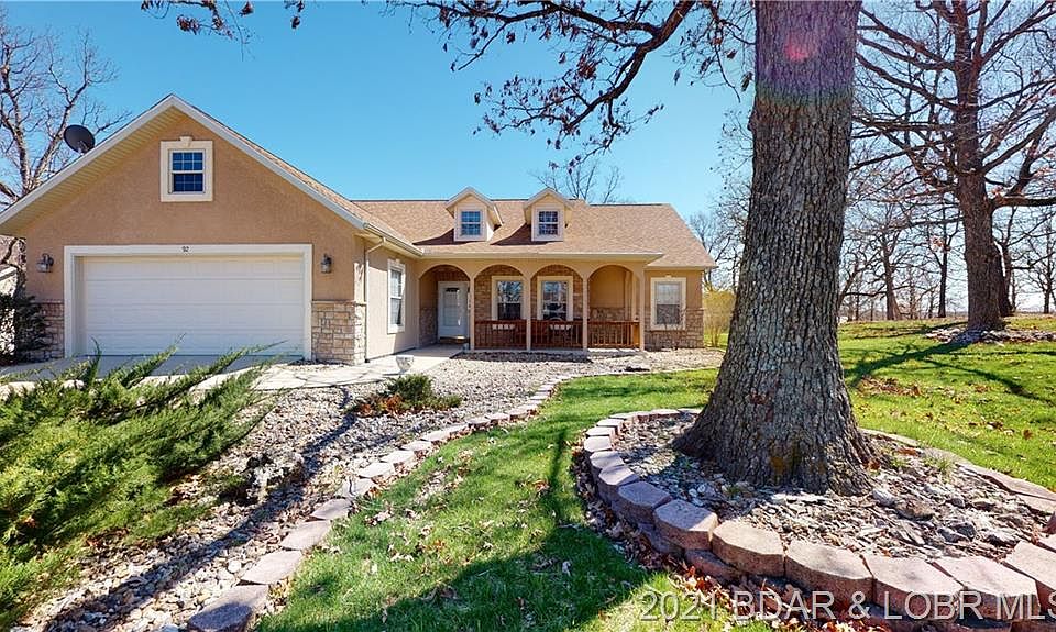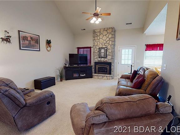 Well maintained, adorable one-level living country home located in beautiful Ravenwood Subdivision. Situated on a large flat lot at a dead-end road, beautiful yard meticulously maintained by current owners. Only 10 minutes to beautiful Lake of The Ozarks boat ramps and the Camdenton square, shopping, and schools. Spacious tiled entry and large living room, cathedral ceilings, arched doorways, and a cozy gas fireplace. Oversized two car garage with pull down stairs to access overhead storage. Master bedroom has coffered ceilings, large walk-in closet, master bath with double vanity, walk-in shower and jetted tub. Two more large bedrooms have a full bath off hallway. All appliances included, stove, dishwasher, refrigerator, built-in microwave in this well-built ranch home. Back yard boasts fencing and a 10x12 storage shed. very private. Ravenwood is a wonderful, quiet neighborhood perfect for full-time living.