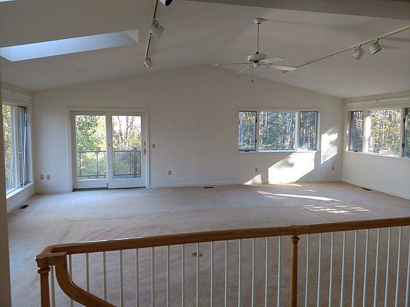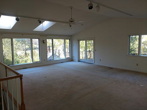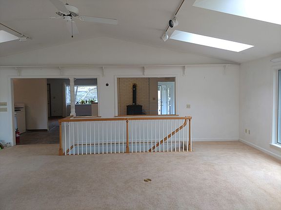 Ranch house on hill. In addition to the 1,843 square feet upstairs the house has another 550 square feet of living space in two bedrooms at ground level facing back yard, each with a private entrance and full bathroom. House is two-stories tall in the back with grand living room with 3 skylights and a wrap-around porch facing woods in back from 2nd story . The house also has an automatic back-up generator and high quality water cleaning system and another 1,790 square feet of storage space in the basement and three sheds.