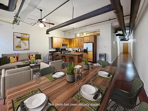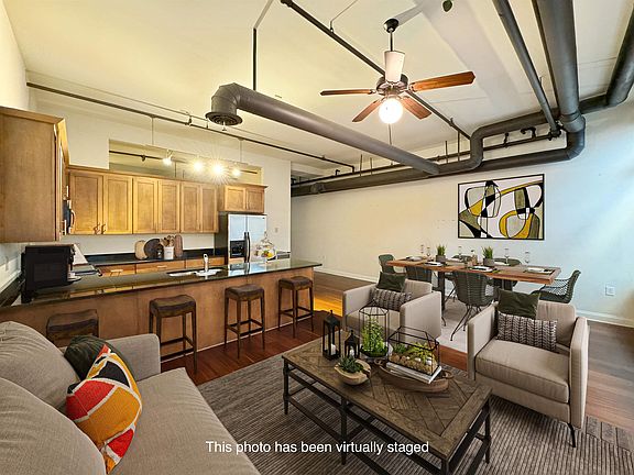 FHA FHA FHA!!! Bring your FHA buyers as we have received a spot approval from Supreme Lending Ashley Koon BACK ON THE MARKET 2/12/25! Downtown living at it's best! Enjoy 2 true bedrooms and 2 full baths! Exposed brick, soaring ceilings, wood laminate through out, 3 huge windows and an open concept will make you love coming home! Large tv remains in primary. Stackable washer/dryer in primary walk-in closet. Easy entertaining from the long kitchen peninsula, tons of cabinets & all appliances. Appliances not warranted. Front door of the building opens on to Main Street for easy access to trendy restaurants, unique shops, NBA/Farm team baseball sporting events and Broadway productions only minutes away. Garage entrance in alley offers secure one assigned space and an elevator to your floor. Located on Historic Main Street near Barbaro Alley.