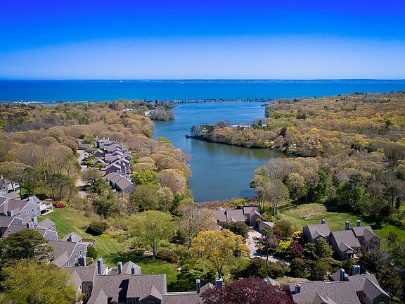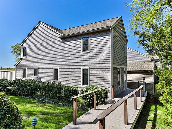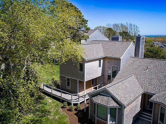 Treetops condo with spectacular views of Oyster Pond and beyond to Vineyard Sound and Martha's Vineyard! This is a larger Treetops condo with 1,880 sq. ft of living space. The first floor features a large open Living Room with hardwood floors, fireplace, cathedral ceiling, a triple glass and a double glass slider to an oversized wrap-around deck. You'll enjoy the water views along with a fabulous southern exposure! The Living Room flows directly into large Dining Room. Large open Kitchen with eat-in dining area. Den/Office and a full bath complete the first floor. The second floor has 2 Bedrooms each with private baths. The Master Bedroom has a fireplace, dressing area and a custom walk-in closet. The basement is unfinished and has a good ceiling height with a walk-out slider for a future finished area, if needed. Detached one car garage with a new custom walkway to the front door. Treetops has recently completed major upgrades including roofs and siding on all buildings and clubhou