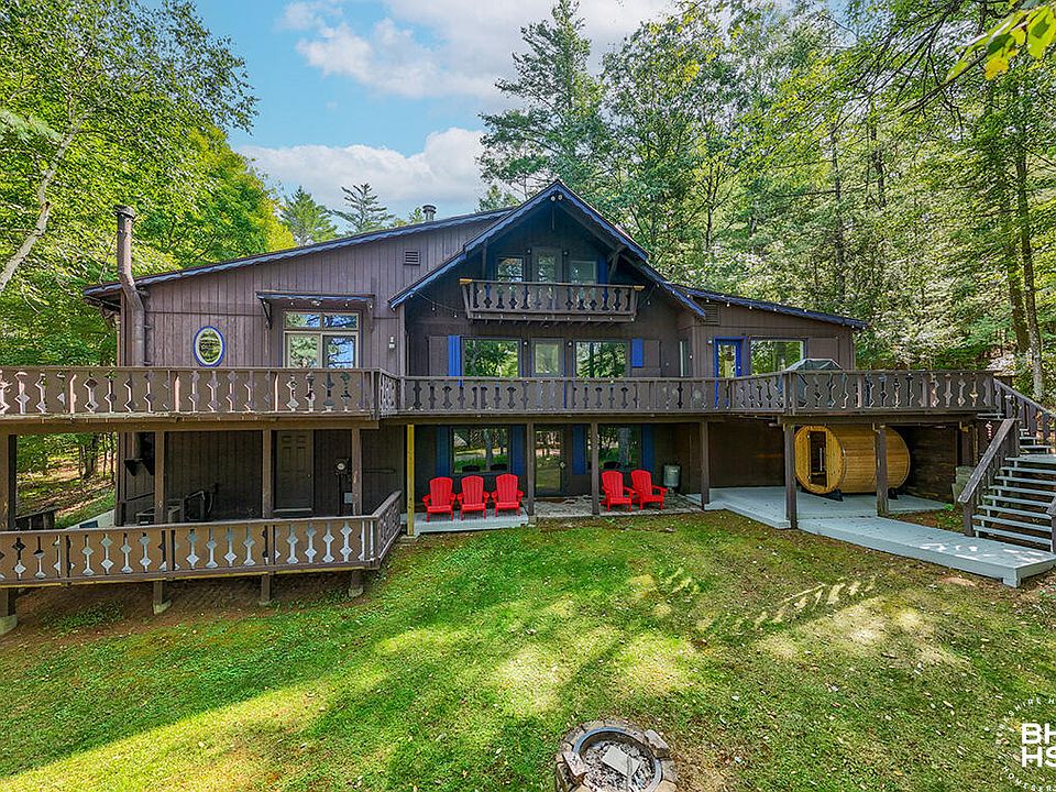 A spacious and privately located home nestled right across from the scenic West Branch of the Ausable River. Enjoy the soothing sounds and tranquil views of the river from the expansive deck, an ideal place for relaxing mornings or entertaining guests. The updated home features a remodeled kitchen, renovated bathrooms, new flooring, fresh interior paint, wet bar with wine refrigerator, and a finished lower level complete with a sauna. Cozy up in the evenings by the Hearthstone woodstove and stay cool in the summer with central air conditioning. Offered fully furnished and turnkey, this home is ready for immediate enjoyment. With a strong history as a successful short-term rental, it also presents an excellent investment opportunity. Whether you are looking for a year-round residence, vacation getaway or income generating property, this home has it all.