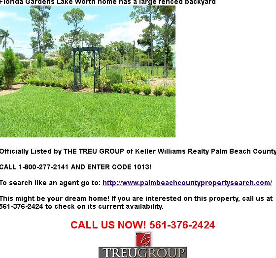 Welcome home! This charming ranch has a large fenced backyard with large garden perfect for those who have that green thumb that gives this home the little extras that make this truly special! Dont wait to see this gem! This is a now run to the phone price. This is a well loved home. All short sales are not equal. We have a proven short sale process that gets a YES.. So go ahead and show it! Calling all gardeners this home comes with a large well maintained garden perfect for those whom have a green thumb! Did we mention that this home also has a large fenced backyard as well as a built in fire-pit! How lovely! This home also includes a view of a canal in the backyard as well as a full auto irrigation system in the yard as well as for the garden. Located in lovely Lake Worth you will only be minutes from the turnpike and local shopping centers. Dont hesitate to come see this lovely home! It wont be around long! Brokered And Advertised By: Keller Williams Realty Palm Beach Central Listing Agent: Lisa Treu