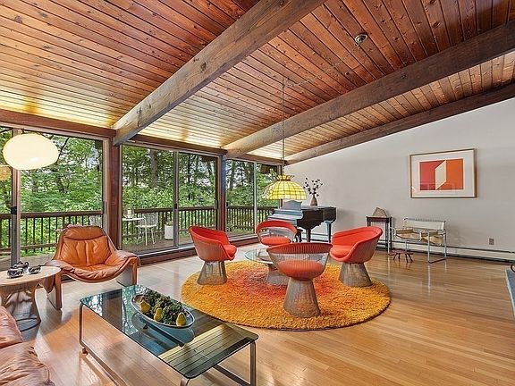 Located on a quiet cul-de-sac in the sought after Annursnac Hill Pond neighborhood, this beautifully rendered custom Deck house welcomes you into the main living level with soaring ceilings and walls of windows that bring year round nature views into this sleek mid-century home complementing its mahogany millwork, Douglas Fir beams and oak floors. Floor-to-ceiling fireplace graces the living room w/sliders to the spacious deck. Kitchen is well-equipped and adjacent dining room opens to a fabulous screen porch for easy summer entertaining. Relaxing primary BR w/double closets, home office/den or guest bedroom and full bath (2005) complete this level. Steps down offers a brilliant fireplaced family room w/sliders outside, 2 additional family BRs, a full bath and laundry/utility area. So wonderfully peaceful and private in a vibrant neighborhood with swimming pond, tennis and pickle ball courts and endless summer fun.