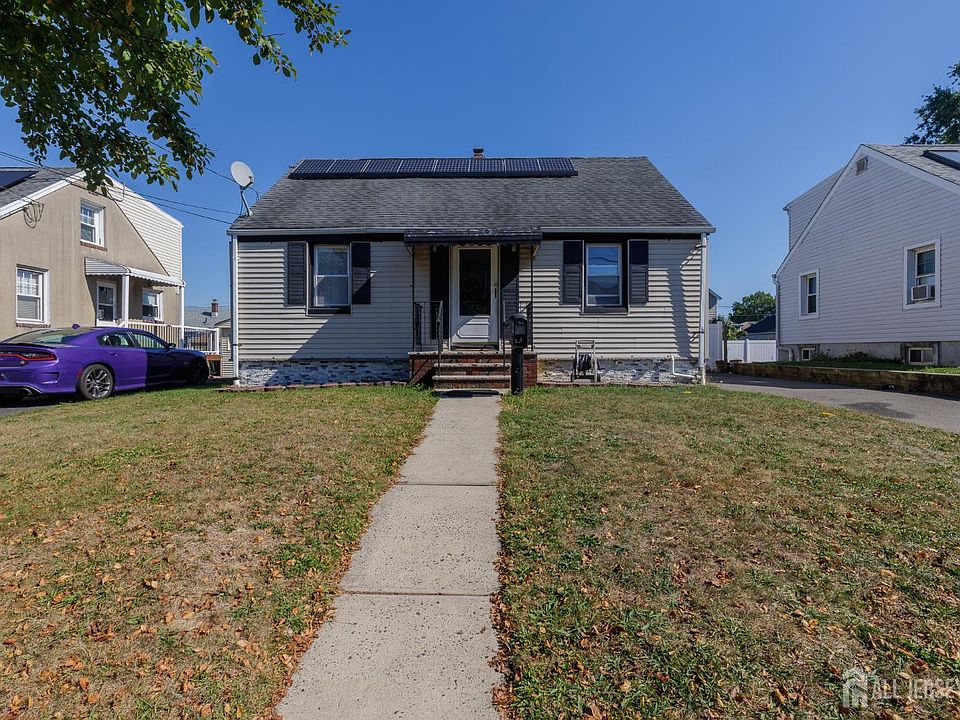 Welcome to this well-cared-for Cape Cod home featuring a newer roof, vinyl siding, solar panels, and a private fenced yard perfect for relaxing or entertaining. Inside, you'll find three bedrooms, two conveniently located on the first floor with wood floors and ample closet space. The updated bathroom has been tastefully remodeled, and the inviting living area also features beautiful wood flooring. The eat-in kitchen provides plenty of space for dining and everyday living. Upstairs, the third bedroom offers great potential to serve as a spacious master suite or flex space to fit your needs. The unfinished basement boasts high ceilings, offering excellent possibilities for future expansion or storage. Situated on a quiet residential street, this move-in-ready home combines comfort, functionality, and energy efficiency all within close proximity to schools, shopping, and major highways for an easy commute. Don't miss this wonderful opportunity to make it your new home!