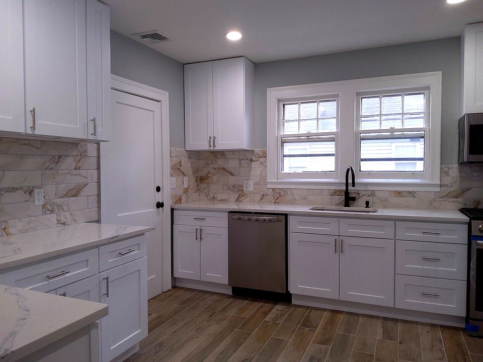 Completely remodeled, move in ready, 2nd Floor unit featuring 2 bedrooms & 1 full bath. This unit offers a convenient layout w/hardwood flooring throughout. Included are a living room, dining room, office space & large kitchen w/new cabinetry, countertops & appliances. Gas heating & central A/C make for efficient and comfortable living. Onsite laundry & off street parking w/1 car garage access. No pets & non smoking property Renter responsible for gas and electric.