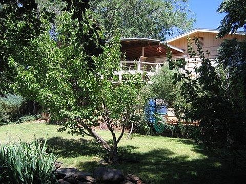 1000 Sq. Ft. 2Br, 2Ba house with A/C, Beautiful Fireplace in living room, Gas log FP in one BR, Oak and Flagstone floors, Cool deck (part covered, part open), grass and lots of fruit trees, through a trellis over a bridge to a hidden garden, Awesome views of Twin Buttes, 5 minute walk to Oak Creek. Near trail-head to Airport Mesa (10 - 15 min. walk) (How about those views!). Probably built in the late 50s, this house has good vibrations! Also comes with Stove w/ Self Cleaning Oven, Frost Free Refrigerator, Dishwasher and Disposal and Washer and Dryer. Eclectic, Old world Sedona, the miniature "Leave it to Beaver" house everybody wants! Great location... About 1mi to Uptown, 0.7mi from Tlaquepaque and Los Abrigados! Nice walks around the Palisades for expansive views of the East Rim. Directions: From the "Y" round-a-bout (hwy 179 and 89A) go west on 89A 1 block to Brewer Rd. (another round about at Burger King) go round about 3/4 the way then go south 0.7 mi... house is on the left across from the north Palisades entrance. 920 Brewer :-) Please Call Chris at five 20 - 2 four 0 - twenty six 15 or Robin at five 20- two five six -- twenty seven 15. Thanks and have a Great Day! 1 year lease. Resident pays all utilities including water, sewer, trash collection, gas and electric. No smoking please. Pets negotiable with extra deposit.