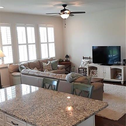 - Interior Features: Ceiling Fans(s), High Ceiling(s), Master Bedroom Downstairs, Walk-In Closet(s), Window Treatments, Open Floorplan, Solid Surface Counters, Solid Wood Cabinets, Eating Space In Kitchen, Kitchen/Family Room Combo, Stone Counters, In Wall Pest System, Thermostat