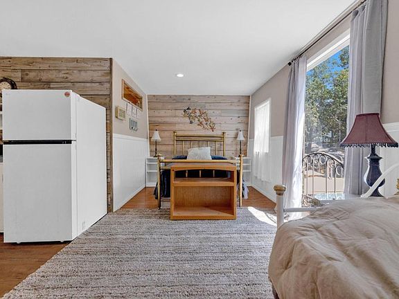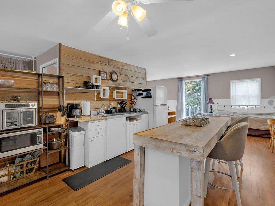 Step inside to find reclaimed wood accents, fresh paint, and a cozy open-concept layout filled with natural light. The galley kitchenette is equipped with brand-new appliances, including a full-size refrigerator, two-burner cooktop, multi-function air fryer, and microwave. A custom-built island doubles as both prep space and dining area, perfect for home-cooked meals or quiet morning coffee.