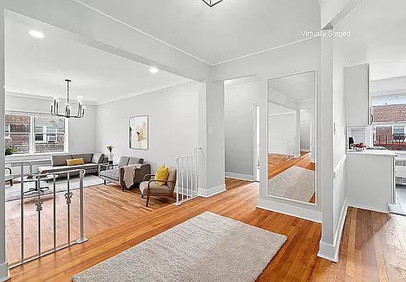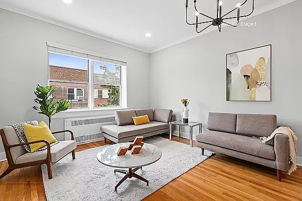 Located on a peaceful tree lined cul-de-sac and perched on the top floor with South facing tree top views, unit 615 is a sun flooded nearly 1200 square foot two bedroom, one bathroom, corner apartment in a sought after, full service, pet friendly coop building. You'll feel welcomed home when you arrive into your foyer with its own large coat closet. Then relax as you step down into the huge, sunken 20'6" x 12'7" living room with an almost 10 foot high ceiling. This unique living room is large enough for a sectional sofa and home office, you'll have plenty of space to live, and work as needed. An updated, windowed, galley kitchen offers plenty of storage and counter space. This layout offers the ease of adjacent eat in kitchen dining with seating for 4 and up or entertaining as you wish. The expansive primary corner bedroom is 15' x 18'2' with 2 closets and large enough for a king sized bed and more, with 3 oversized windows. The newly renovated windowed bathroom is conveniently located between the 2 bedrooms. It's complete with both a large new glass door shower, and soaking tub as well as and all new fixtures. The sun drenched second bedroom is equally expansive with 3 windows and lots of greenery to view. The entire apartment has been renovated with newly skimmed and painted walls as well as tasteful modern lighting. Nothing to do but move-in! Pets allowed. Very short waiting list for underground garage parking at a fee, bike room, brand new laundry room and machines. 25% down payment. 24 Hr. security, doorman, porters and a live-in super. Just a brief stroll away, the Q train at the Avenue J station whisks you to Prospect Park, Downtown Brooklyn and Manhattan in no time at all. Nearby is the Brooklyn Public Library's Midwood branch, Touro & Brooklyn Colleges, shopping & restaurants including the highly acclaimed Di-Fara Pizza. By appointment only.