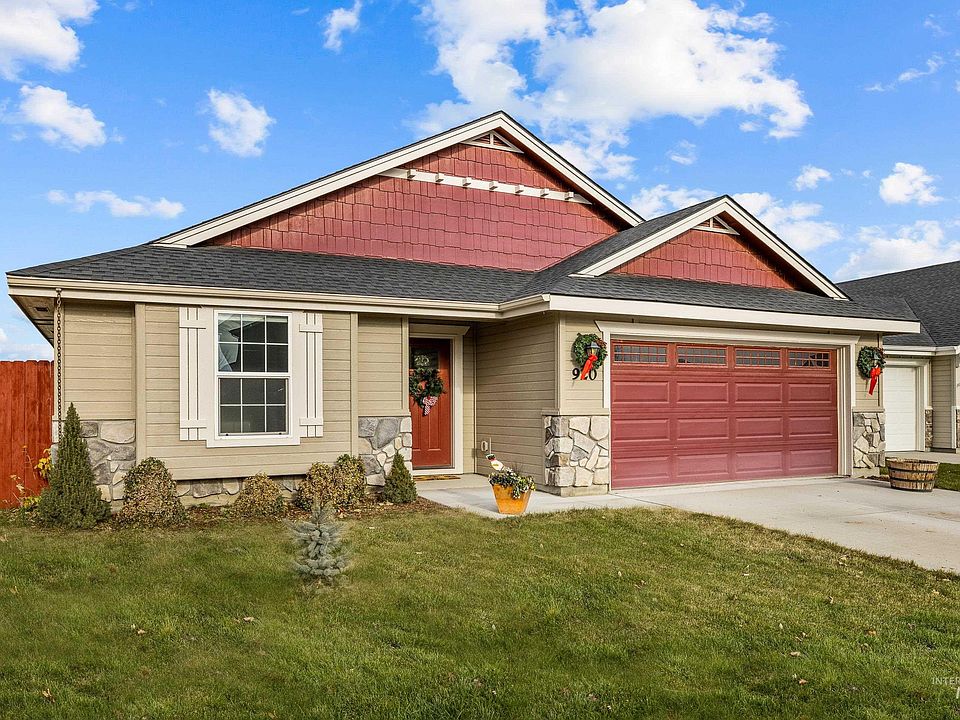 Darling home in charming Kuna community. This home features three bedroom two bathroom split bedroom design with large entryway & mud room w/ built in bench. Take in this open concept in main living area with vaulted ceilings in great room, newer hardwood throughout kitchen, dining room, hallways, entry & new carpet in great room. Spacious kitchen features granite counter tops, pantry, island, fridge & stainless steel appliances in kitchen! Master offers dual vanities, shower, bath tub, & separate toilet area. This home is better then new with blinds, full landscape & fencing, fridge, washer & dryer & newer water softener all included! Come see this darling home today!