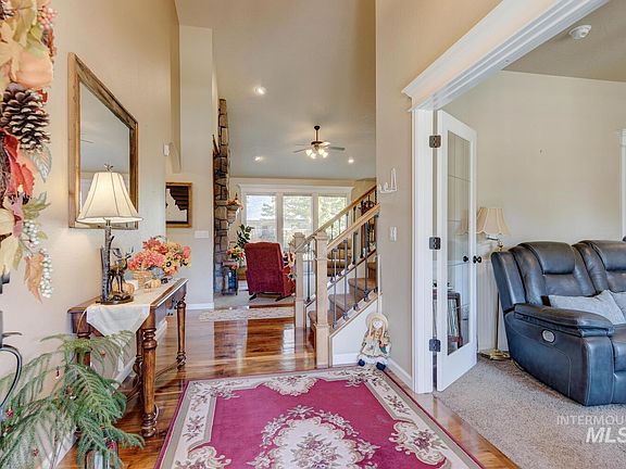 This is a beautiful home in Copper Basin subdivision with vaulted ceilings throughout. Main floor master with dual vanities, large soaking tub, spacious walk-in closet and walk-in tile shower. Second ground-floor bedroom or office has French doors and an ensuite bathroom. Could be a guest suite or mother-in-law suite. Spacious living room has large windows, gas fireplace, and beautiful wood mantle with bookshelves. Entertainment center has covered TV cabinet. Large kitchen/dining area with granite countertops, breakfast bar and hickory flooring, spacious cupboards, and very large pantry for additional food storage. Large laundry room with cupboards, counters, utility sink. Second floor includes two bedrooms, full bath, and enormous game room for ping pong or pool table. Three-car garage with south-facing driveway and cozy covered front porch. Very large yard with mature trees, shrubs, flowers, covered patio with stubbed natural gas. Great schools in walking distance. Warm, family-friendly neighborhood!