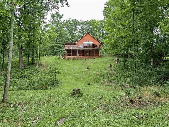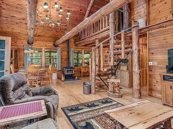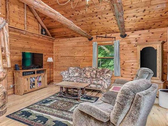 Full log home with 259' of Wixom Lake waterfront and 6.5 wooded acres in a very private, serene setting! Hemlock Point is a private drive with just a few homes so if you are seeking seclusion and to be near state land you have found your new home. The home sits off the road with a very large front yard leading to the waters edge. The covered wrap around porch overlooks the landscaped lawn and the lake and will be a great place to relax and read or chat with friends & family. Step inside and you are greeted by a renovated kitchen complete with granite counter tops and stainless steel appliances. The hickory flooring and log breams in the cathedral ceiling add to the warmth of this home. Main level master bedroom and a 2nd bedroom in the loft that is accessed by a spiral staircase. Enjoy the Brady Sunroom and walk out basement family room/bar! 30x40 pole barn w/ 10' walls has a wood stove. Furnishings & boat included! Don't miss this one!