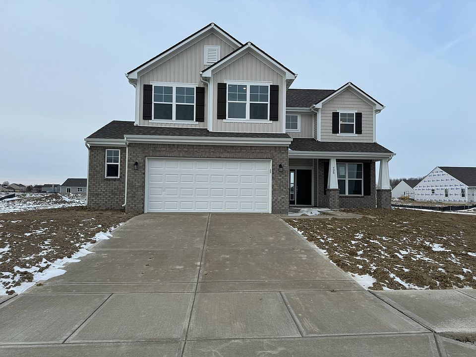 The Asepn II, a spacious 4 bedrooms, 2 and a half baths, and a 2-car garage home with keyless entry for your utmost convenience. Feature brick and vinyl siding, Board-n-Batten shutters, full front porch. Upon entering, you are greeted by 9-foot ceilings on the first floor, The flooring on the first level is with vinyl plank, providing both durability and a touch of elegance. The carefully designed layout encompasses a study, great room, dining room, kitchen and a convenient half bath featuring a tall, elongated toilet. The kitchen features a breakfast bar with 2CM quartz countertops complemented by 36-inch-tall straight cabinets and cabinets above the refrigerator for ample storage. The stylish tile backsplash adds a contemporary flair. High-quality Frigidaire stainless steel appliances, including a microwave, dishwasher, and electric range stove, elevate the kitchen's functionality. Kitchen pantry included for additional storage. The breakfast bar contains 9'' deep undermount kitchen sink adds practicality to the space. Adjacent to the kitchen is the a sunroom, through the sliding doors to a 3x3 concrete stoop. Venture to the second floor to the primary bedroom, featuring a step ceiling, attached bathroom with double sinks, a garden tub, a standing shower, and a spacious walk-in closet. Three additional bedrooms on the second floor come complete with individual closets, offering privacy and comfort for family members or guests. Hall bathroom on the second floor features a tub-shower combination and tall, elongated toilets. All bathrooms boast 2cm quartz countertops and standard cabinets. Second floor also hosts a well-designed laundry room with vinyl flooring. Home is equipped with an electric furnace and heat pump, complemented by a digital thermostat for easy temperature control. The 50-gallon electric water heater ensures a reliable supply of hot water for your daily needs