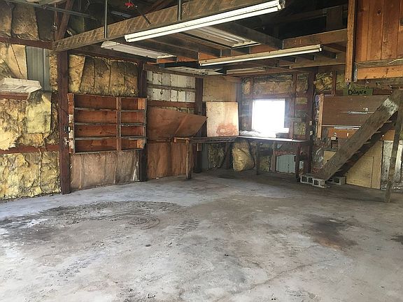 24’ x 30’ Morton building with 12’ tall sidewalls and good concrete floors. 18’w x 10’t roll up door and one walk in door. Has storage platform in rafters on back 2/3rds. Wood burner included. Gravel in west side of shop for parking. Home needs extensive repairs, has a newer roof. One stall garage between house and shop.