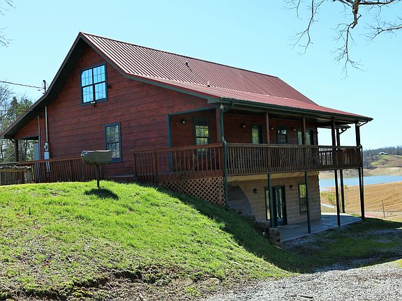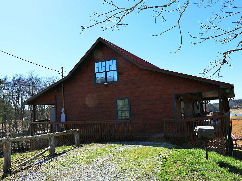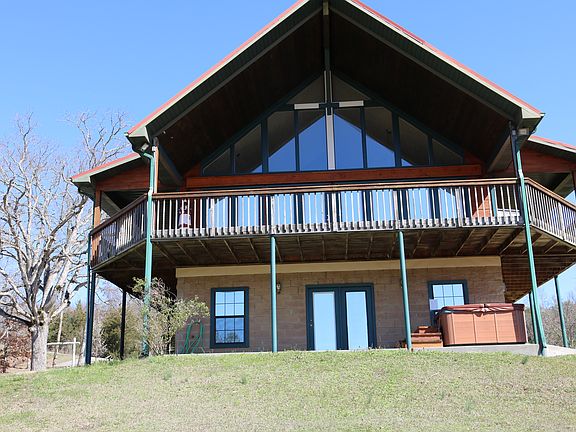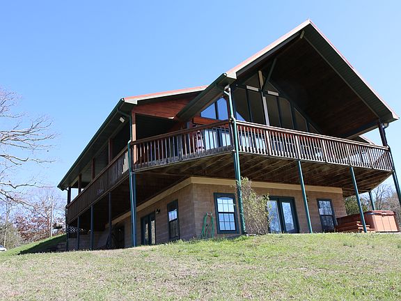 Dynamic view on this lake front property sitting on its peninsula with water on around two sides. Spacious home with ceiling to floor windows to view the lake. Ceramic tile on main level and downstairs for maintenance free floors. Two story living room ceilings with so much light. Fireplace for cozy nights. Open floor plan with kitchen, dining and living room. 4 bedrooms, three baths and a recreation room down on basement level, that opens to lake and hot tub area. You can walk down to the water from here to your fantastic gazebo and fantastic floating dock for your boat. Over $35,000 spent in this area alone. When you see it, you will know why. Walk around deck on main level. Room to park your boat and anything else you have for water activities. I am very impressed with this home and what it has to offer. You will not be disappointed! Home comes completely furnished including game room downstairs. Just bring your suitcase! Views from everywhere in cabin. You can watch the sunsets from your living room every night and there are bass right outside in cove to catch. Complete privacy around this home.