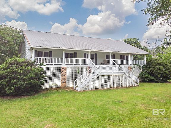 This 5 bedroom 3 bath home sits on 8.7 acres of quiet and serene land in Bay Minette in northern Baldwin County. Level acreage with trees and room for gardens, pool or livestock. There are no restrictions on this land and it presents a versatile opportunity for families or investors. The expansive land allows for various possibilities such as more buildings or another home. This spacious home has two levels and could easily be converted into two living spaces. The upper level has a large living room dining room that can accomodate a growing family with ease. Wood floors make upkeep simple. Porches on the upper level that span the entire length of the house are on the front as well as the back . There is a bathroom and kitchenette in the lower level as well as bedrooms and an office. The flexibility makes it appealing those looking for both a spacious residence and a property with investment potential. Call your agent today and make your appointment to take a tour. Buyer to verify all information during due diligence.