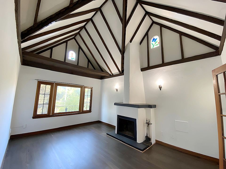Charming vintage tile accentsRefurbished rich hardwood floorsFrench doorsStained glass windowsSoaring beamed cathedral ceilings