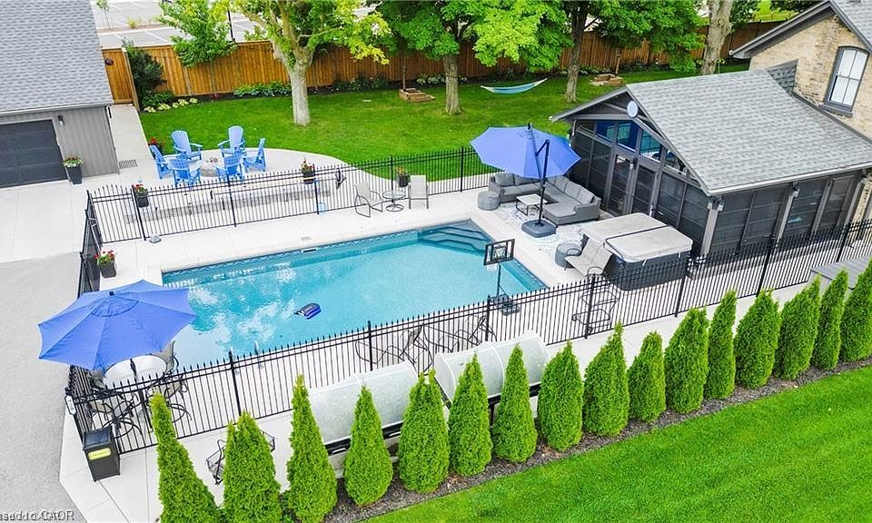 Experience the perfect blend of character and modern luxury in this beautifully restored farmhouse, set on a private 2/3-acre lot in Kitchener’s desirable Rosenberg subdivision. Surrounded by scenic trails and green space, this iconic residence combines timeless architectural details — including a curved staircase, stained-glass accents, and oversized baseboards — with thoughtful high-end updates throughout. At the heart of the home is a beautifully renovated, chef-inspired kitchen with quartz countertops, premium appliances, a built-in coffee bar, and a generous walk-in pantry/mudroom. A bright and spacious 3½-season sunroom offers the ideal space for year-round entertaining or quiet relaxation. Upstairs, a spa-like bathroom boasts custom tilework and a quartz vanity, while a convenient second-floor laundry room adds everyday ease. Major infrastructure upgrades — including 200-amp electrical service, new HVAC, plumbing, roof, eaves, and repointed masonry — ensure worry-free living. An exceptional bonus is the fully detached, self-contained coach house featuring its own HVAC, 100-amp service, full bath, bedroom, living area, and a main-floor space ready for a kitchen. Plus, there’s a finished basement ideal for a gym, studio, or creative space. Perfect for multigenerational living, a home-based business, or potential rental income (pending city approval). The resort-style backyard is an entertainer’s dream, with a 15' x 32' smart-controlled pool by Tim Goodwin, professional-grade putting green, gas firepit, RV parking, invisible pet fencing, and a new irrigation system — all framed by mature maple trees. Located steps from RBJ Schlegel Park with its sports fields, playgrounds, and planned rec centre, this home offers a rare blend of luxury, lifestyle, and location. A truly unique opportunity in Waterloo Region!
