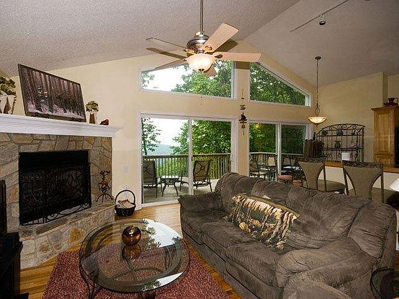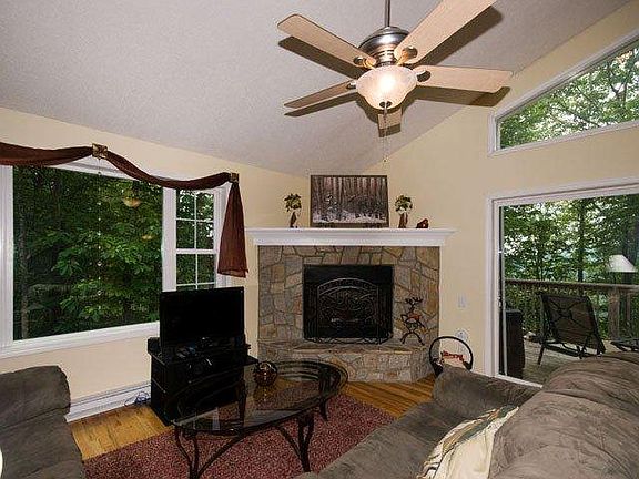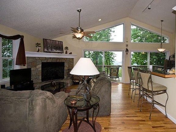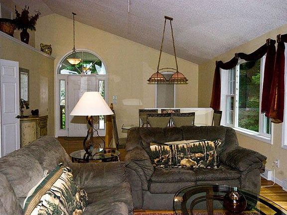 Picturesque views. Wonderful floor plan with master on main level and large open living area. Lower level has family room, 3 bedrooms and two baths. Paved road, good parking area. Walking distance to the town recreation center. Nice furniture and furnishings included. Built on two lots.