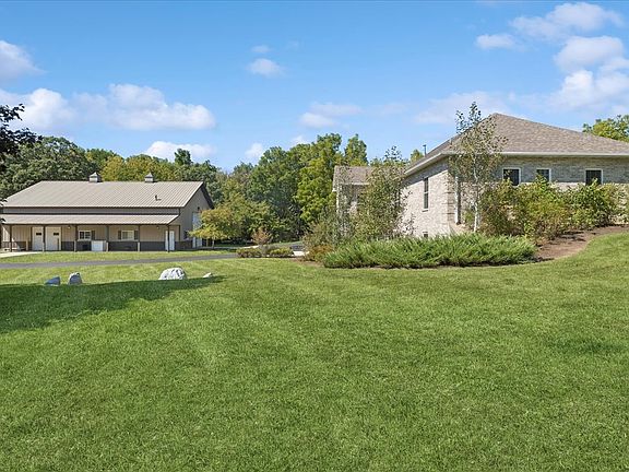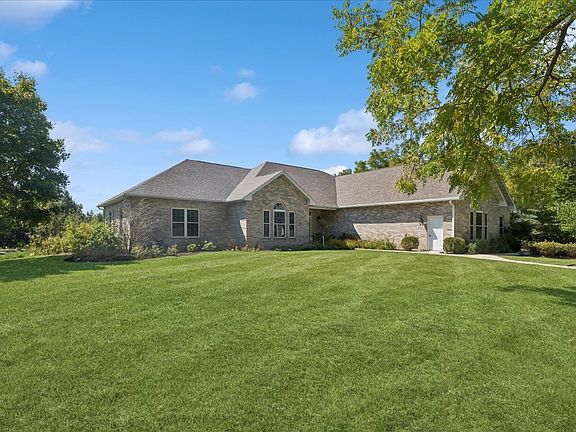 Absolutely stunning custom all brick ranch home with finished walk-out basement on 3.06 lush professionally landscaped grounds with native plantings. Home was completely remodeled in 2021 and initially inhabited 12/2021. An amazing 42x60 heated pole barn with concrete floor, 14' overhead door, mezzanine, and bath. 10 zone irrigation system, new composite deck 2022, new roof 2022, 4 season room, and stamped concrete screened in patio. Enter into the spacious foyer with custom cabinetry and porcelain flooring, professionally refinished chefs kitchen cabinets with custom maple island w/seating and quartz countertops. Shared floor 2 ceiling stone 2 sided gas fireplace between living room and kitchen. Vaulted or 9' ceilings thru out, custom mill work in family room, office, and primary bedroom, all new refinished or new hardwood flooring thru out. Open concept living with an abundance of natural light. Finished walkout basement offers a gaming area with wet bar, family room, exercise area, full bath and 3-4 person sauna, along with 2 additional bedrooms and 4 season sunroom with access to the screen patio. in 2022 a whole house back-up generator was added. A total of 5 bedrooms, 3 1/2 baths and 5744 finished sq ft of living space. 4 brick solar lighted pillars guide you through the 2 entrances and circular driveway. A truly amazing, move in ready home.