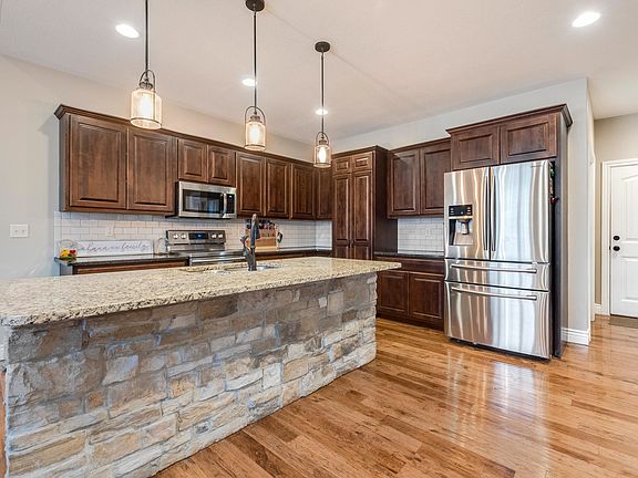 Welcome to country living! This beautiful home is situated on almost 1 acre of land and features a creek along the back of the property and 6 car garage space! The circle drive gives ample room for parking and makes pulling in or out of the driveway a breeze. Walking into the home you are sure to notice the hand scraped hickory flooring, amazing view from the living room windows, high ceilings, and the gas fireplace surrounded by stone. The kitchen and dining are open to the living room through an attractive archway. The island is very stylish and the rock on the front of the island matches the fireplace! The kitchen has plenty of counter space and storage- granite counter tops and a hidden pantry are features you are sure to love! All of the appliances in the upstairs kitchen stay! The dining area has plenty of room to host a crowd and the view from the windows will add to the experience. On the other side of the kitchen is the main floor laundry room and entrance to the attached three car garage. Down the hallway are the three main floor bedrooms. Through the double doors is the master suite. Large enough for a king bed, high ceilings, door to the back deck, and beautiful view through the windows. You'll love the heated floor in the master bath! Double sinks with quartz countertops, jetted garden tub, separate shower, water closet, and the biggest walk in closet you've ever seen! Both of the additional bedrooms upstairs have plenty of natural light and are generously sized. The second bedroom has vaulted ceilings and a large window with transoms. Heading downstairs the switchback staircase features wrought iron spindles in the railing. The finished basement features a large living room with wet bar, and an additional master suite! The bedroom downstairs is very large indeed and has plenty of closet space. The bathroom can be accessed from the bedroom or hallway. The basement is rounded out by an additional laundry area, and a safe room with a locking steel door that can double as a walk in gun safe. Back upstairs, step out onto the covered composite deck and enjoy the privacy of the lot. Deer and turkey have been known to visit from time to time! There is a one car detached garage, and a two car detached garage as well. The two car is insulated, wired for 220 and has a wood burning fireplace! Great additional entertaining space or, of course, an amazing workshop. A few more details about this high quality home- It features city water, with sprinklers on a well, split HVAC system for maximum comfort, Low E windows, R38 insulation, and LED lighting. This property has it all- don't wait to schedule your private showing!