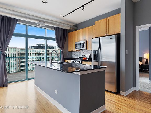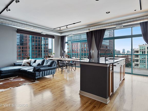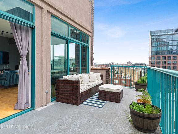 Phenomenal private outdoor space and great natural light in this heart of West Loop 2 bed/2 bath corner unit in an elevator building. Floor to ceiling windows, high ceilings, two fully enclosed bedrooms, split floor plan and open great room. Kitchen offers maple cabinetry, full height stone tile backsplash, double sink, stainless steel appliances, granite countertops and breakfast island. Generous sized main bedroom features walk in closet and en suite bath with separate shower and oversized soaking tub. Enormous, nearly 400 sq ft walk out terrace provides plenty of space with expansive city views. Large foyer entrance provides great storage with separate coat closet, pantry and in-unit laundry. One car deeded garage parking and additional bonus storage included in offer price. Incredible West Loop location close to it all; bars, outdoor patios, boutiques, shopping, Morgan St. Pink/Green Line, Randolph St Restaurant Row and Fulton Market.