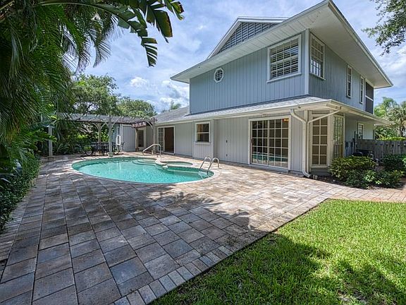 Incredible Value! River access steps away & access to Vero's best beach! Spacious 3BR/3BA pool home. Move in condition! Tongue & groove vaulted ceilings; split BR plan; cabana pool bath; large fenced side yard; outside shower; Island kitchen; breakfast room; 2nd floor master w/large screened balcony & peak at the River! Private pool w/covered pergola. Sizes are approx/subj to error.