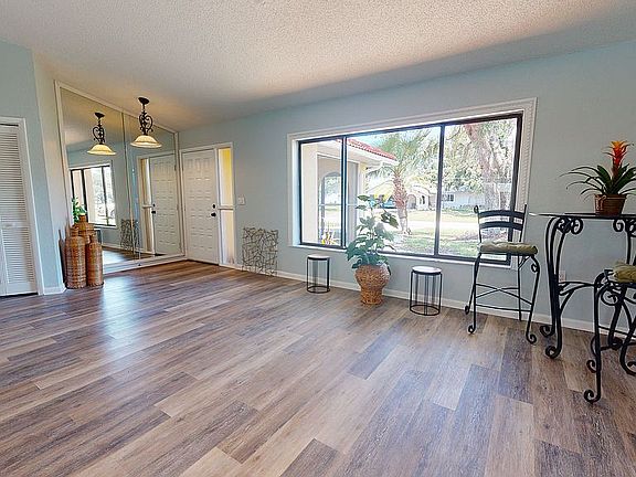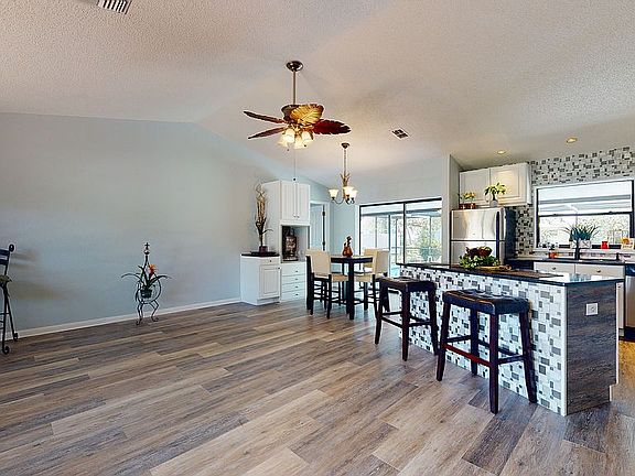 Will not last! Updates galore in this wonderful home and nestled in a nice neighborhood. Pulling up to the home you are welcomed by mature oak trees and a Spanish tile roof. Freshly painted inside and out. Inside you have a completely open floorplan you will love. Beautiful vinyl plank flooring throughout all the living and kitchen areas. Cathedral ceiling in the living space really opens things up. The kitchen is updated with black granite countertops, a large island, white cabinets with a lazy Susan bottom corner cabinet, stainless steel appliances, and a decorative backsplash. The guest bath has an updated vanity and recessed lighting. The guest bedroom is a nice size with great closet space. Part of the garage has been converted to a 3rd bedroom, this area can easily be converted back to a full garage if needed. The master bedroom has two closets, access to the lanai, and an updated bathroom attached with beautiful vanities and recessed lighting. The pool has been converted to saltwater, clean/service/ and rental of equipment is only $79 monthly with no contract. A passthrough window from the kitchen the lanai is a nice little attribute when entertaining guest poolside. The back yard is partially fenced, the materials are available to finish the back. Another beautiful winding oak tree shades the back yard and the shed provides added storage space. Don't wait call now!