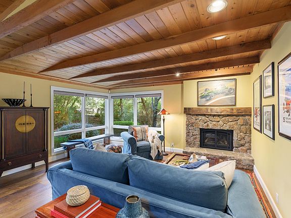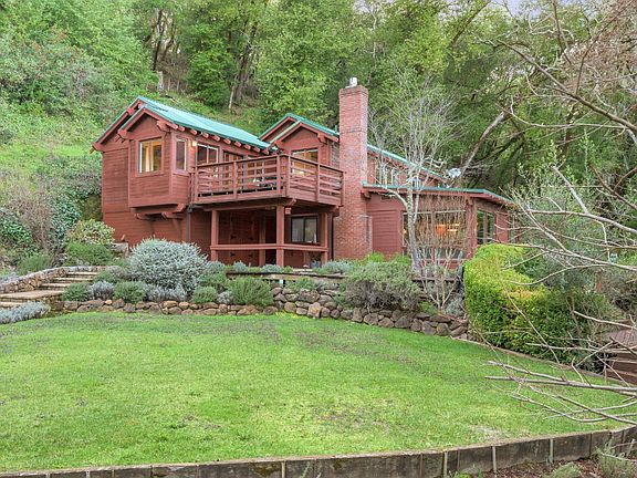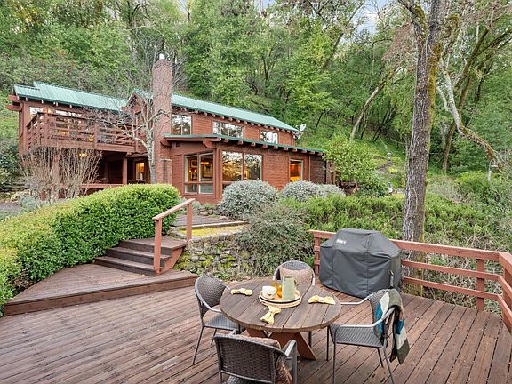 Set along Yulupa Creek on approximately 2.5 acres, this light-filled Craftsman-inspired home offers privacy, natural beauty, and a peaceful Wine Country setting just minutes from Glen Ellen. Surrounded by mature trees, fruit trees, and walking paths, the property feels tranquil and immersive. Inside, exposed beam ceilings, hardwood floors, and a Sonoma River Rock fireplace with reclaimed wood mantel create warmth and character. The main level features an open great room combining the updated kitchen, dining, and living areas. An upstairs second floor and loft area provides a cozy retreat with scenic views, plus the primary bedroom has an exquisite, vaulted wood beam ceiling. Outdoor living includes level areas, mature landscaping, and a hot tub overlooking the trees and creek. Additional structures include a large three-car garage and a separate garage/studio building for flexible use. Recent kitchen and bath updates enhance this serene retreat near Jack London State Park, wineries, and village amenities.