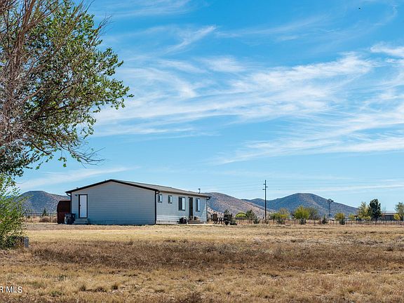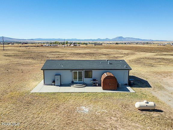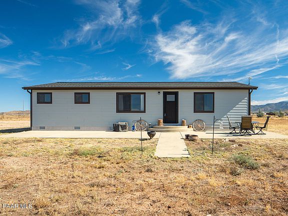 Welcome to your dream retreat! This beautifully upgraded 3-bedroom, 2-bath manufactured home is nestled on just under 10 acres, offering breathtaking panoramic views of Prescott and Prescott Valley. Step inside to discover a modern open layout featuring brand-new flooring throughout. The heart of the home, the kitchen, boasts new cabinets that perfectly blend style and functionality, making it an ideal space for cooking and entertaining. The spacious living area seamlessly connects to a brand-new sliding door that invites you to enjoy the stunning outdoor scenery. Additional highlights include a newer roof and energy-efficient heat pumps for year-round comfort. All appliances are included, making your move-in process a breeze. Outside, you'll find a large workshop with cove