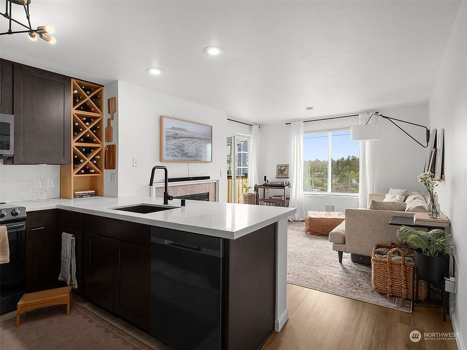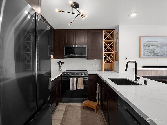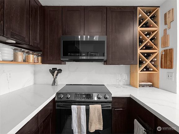 Discover this rare 2-bd, 1-bth condo in Seattle's Greenwood neighborhood! The primary bedroom features sliding glass door leading to a private deck with stunning Olympic Mountains & sunset views. The second bedroom, with custom built-ins, doubles as a perfect office or study. The kitchen, updated in 2023, showcased elegant quartz countertops, wine storage, under-cabinet lighting, & smart appliances. Enjoy new LVP flooring throughout along with storm windows for excellent soundproofing. The secure parking garage & new digital call box fob system add convenience and security. Enjoy easy access to public transport, the convenience of a new Trader Joe's, trendy restaurants, & cozy coffee shops --all just steps away! Don't miss this gem!