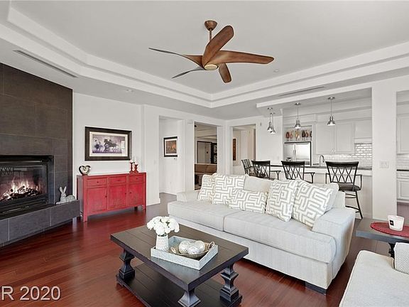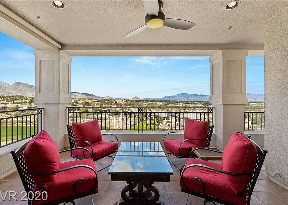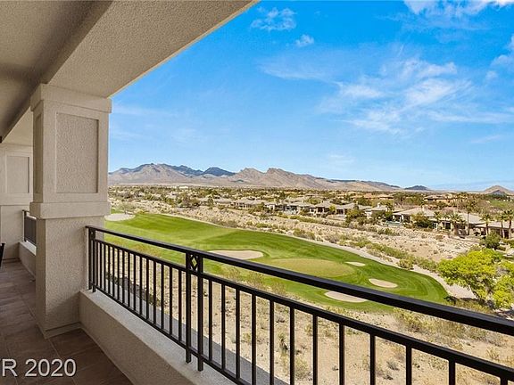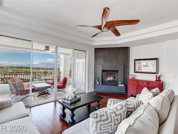 Guard gated Summerlin condo with sensational golf, mountain, and sunset views. Direct elevator access to your 4th floor penthouse residence with a huge balcony looking at Red Rock Canyon. Fresh contemporary design features wood floors and a highly upgraded white kitchen with double ovens. Large master with custom walk-in closet + dual vanities. 3-car garage. Community clubhouse, fitness center, pool, spas & more!