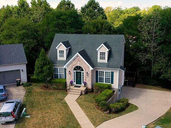 This lovely Jeffersontown Cape Cod sits on a quiet cul de sac. The first floor Living Area has a soaring ceiling with large windows that flood in the natural light. With the onset of fall, you'll love to gather around the gas fireplace. The Living Area flows right to the Dining and Kitchen Area, perfect for entertaining. The first floor Primary Suite is a luxury retreat with a large soaking tub, walk in shower, and huge walk in closet. Upstairs you'll find two more bedrooms each one with large closet space plus the hall bath. A lovely balcony overlooks the Living Room. The finished walk out basement is the show stopper! With built in shelving, more storage space, and a built in overhead projector with huge movie screen, you'll have the perfect spot to host game day or movie night!