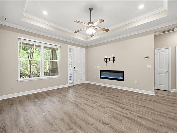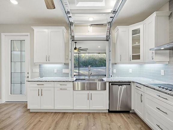 Prepare to be impressed the moment you step inside this beautifully upgraded home. Elegant tray ceilings highlight both the living room and primary bedroom, while 6" baseboards flow throughout for a clean, modern finish. The kitchen immediately commands attention with 42" cabinets topped with crown molding, soft-close features, under-cabinet lighting, and premium upgrades including quartz countertops, stainless steel appliances, a pot filler, and a distinctive garage-style window that opens directly to the patio, perfect for effortless entertaining. All bedrooms feature carpeting, while every bathroom showcases tile flooring and beautifully tiled showers. The primary suite is further elevated with a luxurious rain shower head, creating a spa-like experience at home. As you move toward the outdoor living area, a covered and screened patio invites you to relax year-round. The complete outdoor bar is built for hosting, featuring granite countertops and a beverage fridge. Gutters surround the entire home for added convenience and care. Inside the garage, you’ll find epoxy-sealed flooring and a Wi-Fi–enabled insulated garage door. Additional thoughtful enhancements include CCTV pre-wiring with cameras, an in-wall built-in safe in the primary bedroom, and a hideaway sliding screen at the front door. Quality construction adds even more value, with block exterior walls, spray foam insulation, and fully insulated exterior walls providing comfort and efficiency. Lightly lived in as a second home, this property feels nearly brand new and is truly move-in ready.
