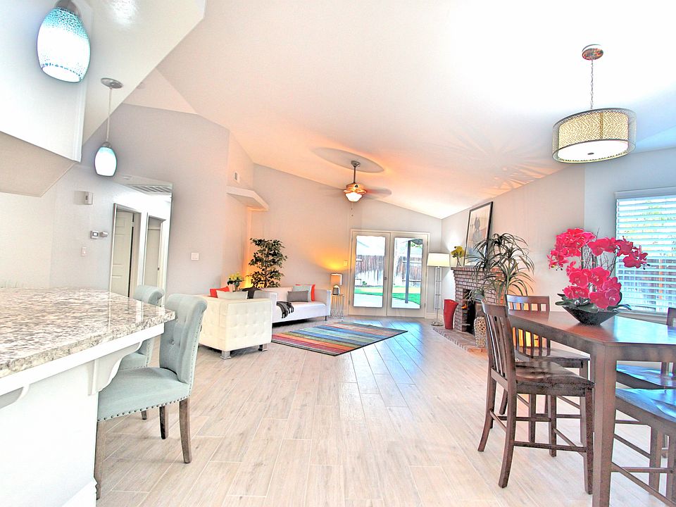 Beautifully remodeled home close to golf, schools and shopping. New roof. New Samsung appliance package, granite countertops in kitchen & bathrooms - w/ subway tile backsplash, tons of wood-looking tile, new carpet w/ memory foam pad, spacious living room w/ vaulted ceilings. Well designed, & reimagined. Phone/USB gadget chargers directly from outlets. New garage door opener. Plenty of storage, & all cabinetry has been updated with oversized - modern cabinet pulls. Beautiful fireplace is sure to be enjoyed by the lucky new owner. Keyless entry, with reprogrammable keypad - convenience & security combined! Professionally landscaped with a mix of established trees, new plants, sod, large rocks & fresh mulch. New sprinkler timer, valves & heads New ceiling fans & modern chandeliers. New faucets, sinks & garbage disposal. Covered patio accessed from living room & Master b/room. Not your typical remodel. This kind of home does not come along often. Will not last! (no FHA offers until February)