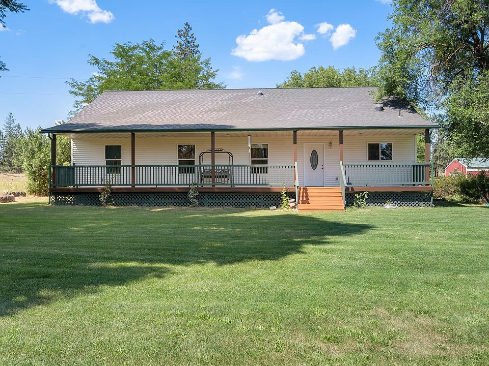 Seller offering a $15,000.00 buyer credit offered at closing for rate buy down or closing costs. Beautiful rancher on 34+ spacious acres! Enjoy country living, yet close to town. This amazing home includes a full length covered front porch, 4 bedrooms, 2 baths, open kitchen & great room. Stay cool this summer with central A/C and enjoy the warmth of the propane fireplace during the winter months. Property is fenced & cross fenced and has a variety of rock outcroppings, trees, pastures, and sloped hillside. Pastures have plenty of room for grazing of horses or other large animals. Shallow springs contribute to sub irrigated pastures which keeps pastures green and a seasonal stream. Lots of storage in 40x80 barn and 30x40 shop with tack room. Close to many amenities including approx. 20 minutes to Fairchild AFB, 10 miles to Spokane city limits and 10 miles to Long Lake.
