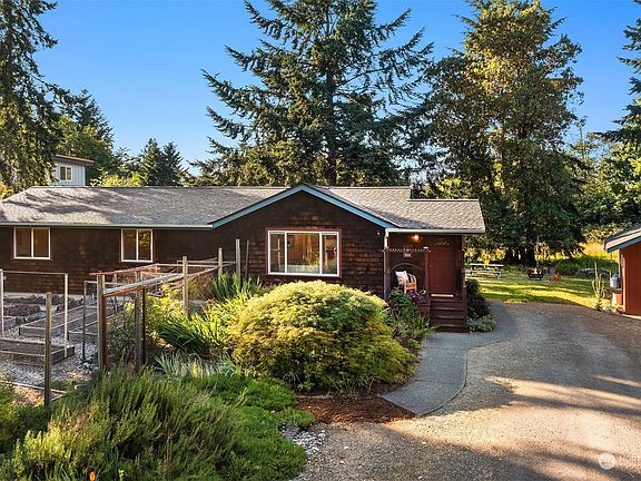 Step into a timeless classic. This one-level, 1,760 sf home features 2 bedrooms, a full bathroom & an office. There is a primary wing with a large bedroom, walk-in closet, powder room & spa-like bathing space, including a jetted soaking tub. Depart the primary suite through French doors that lead to a private deck. Beautiful finishes include maple & Marmoleum flooring, fir trim throughout, lovely tiled bathrooms, PaperStone kitchen counters, solid fir doors, & cedar decking. The front yard has a fenced garden area, raised beds & blueberry bushes. The backyard also has a fenced garden area with a view of a peaceful pasture to the north. Close to the Dockton Forest trail system and just up the hill from the private Sandy Shores Beach park.