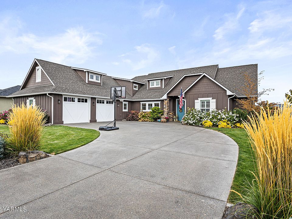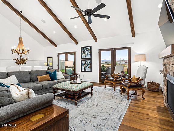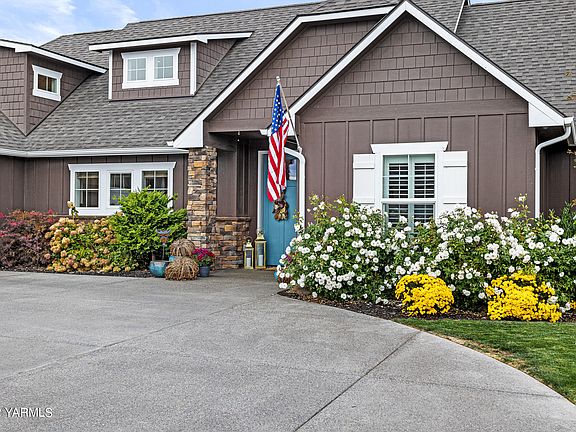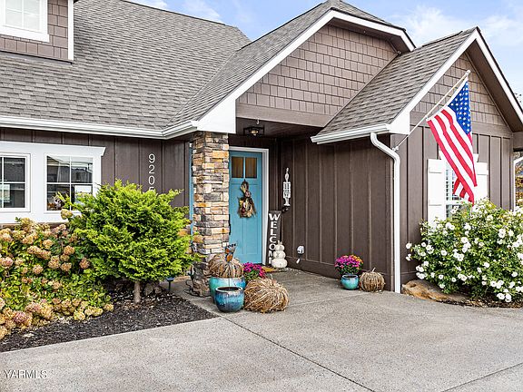 It is okay to oohh and awwwe over this gorgeous custom built home from Apple Tree Construction. Located in a gated neighborhood and part of the Apple Tree community once you enter inside this home you'll feel like you're in a French Chalet. Soaring ceilings with exposed beams and huge windows with a view of the north side of West Valley in Yakima will quickly grab your attention. This open living space is one sure to please! The kitchen includes quartz counters, stainless appliances, a hidden drawer inside the island for perfectly camouflaging the bulky microwave and custom cabinets. The dining and expansive great room feature brand new hardwood floors and the fireplace draws your attention with the floor to ceiling stonework. On one side of the home, an owner's bedroom retreat features a large custom tile shower, large vanity, and more than 100 square feet of walk-in closet. Two additional bedrooms and a full bathroom are on the opposite side of the home. And upstairs you have another bathroom, wonderful bonus living space and the fourth bedroom. In the private fenced back yard outdoor living will be so sweet. The porch is covered and includes a speaker system, and it is plumbed for water and gas to make your BBQ's extra easy. The storage unit can house quite a bit too, often a small boat likes to hang out inside it. While you're here be sure to look for the following upgrades: garage doors, Ring security, Honeywell air filtration system, laundry space for an oversized washer and dryer and access to the private community pool and park. 9205 Harvest Lane offers more touches only found in the finest of custom homes so be sure to check this home out soon!