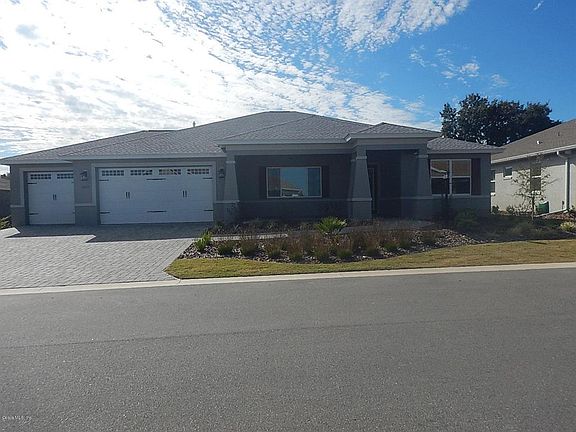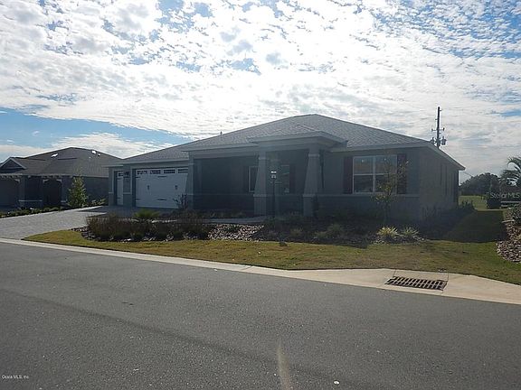 Wonderful Brighton inventory home! This 2 bedroom, 2 bath home with living room, breakfast area, a flex room, and a 3 car epoxy coated garage with golf cart space just shines with gorgeous features and elegance! Upon entering into this home you will see the pretty French doors leading into the flex room and the then the guest room with guest bath featuring with quartz counter and step in tub. The stunning kitchen features a large breakfast area as well as gorgeous staggered cabinetry, stainless steel appliances, including micro/wall oven combo, quartz counters, tile backsplash, under cabinet lighting, and huge center island overlooking the living room! The living room is spacious, with sliders to the Lanai. There is pretty 20" x 20" ceramic tile flooring, with carpet in the bedrooms and crown molding through all the main areas. The master suite is spacious with a long wrap-around closet. The master bath has a double vanity sink, quartz counters, and a walk-in shower with a bench. Step out onto your lanai with your favorite beverage and enjoy your day! Located in Ocala's premier, gated, active 55+ community, loaded with amenities, including golf cart access to two shopping centers.