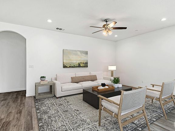 Welcome to this stunning 4-bedroom, 3-bathroom split-wing home offering 2,155 sq ft of modern comfort and style. Built in 2021, this thoughtfully designed Jeremy Willer build features luxury vinyl plank flooring throughout and elegant marble countertops. The open-concept kitchen and living area provide the perfect space for entertaining or relaxing. Two large bedrooms share a fully equipped bathroom making it the perfect guest wing. In the other wing you'll find a 3rd large guest bedroom and bathroom making it the ideal bonus room for your office, indoor gym and so much more. The spacious primary suite is a true retreat, complete with a dual vanity, soaking tub, walk-in shower, and a generous walk-in closet. Enjoy the outdoors year-round with a covered patio ready for dining or BBQing with friends and family. Why wait for new construction? Don't miss this one while it lasts!