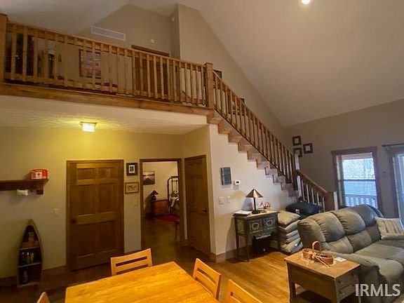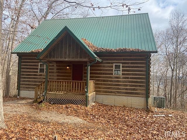 9206 S County Rd 625 W, English, In Unique Patoka Lake Area Home that has 6.91 wooded acres that borders Patoka Lake Corp of Engineers Boundary with seasonal water view(see aerial photos)! Walk to the lake from your own custom built authentic log sided 1 1/2 story home with a full mostly finished basement there is a full bath on each level making this a desirable overnight rental with a proven history, presently there are multiple beds in the basement and loft bedroom. The main level features the master suite with tile walk in shower, modern kitchen and great room with vaulted ceiling with wood flooring, the loft has a bedroom and full bath, the basement has a family room/recreational room, bathroom and mechanical room. Complete washer and dryer hook up. The main level covered deck overlooks the scenic woods towards the lake. Gas fireplace for the chilly nights! All for only $345,000