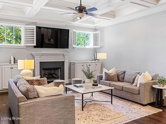 The hearth room exudes warmth and grandeur with its stunning coffered ceiling and built-in cabinetry framing a gas log fireplace. The first floor also includes a guest suite, a sophisticated office, and a trio of built-in cubbies near the three-car garage for effortless organization.