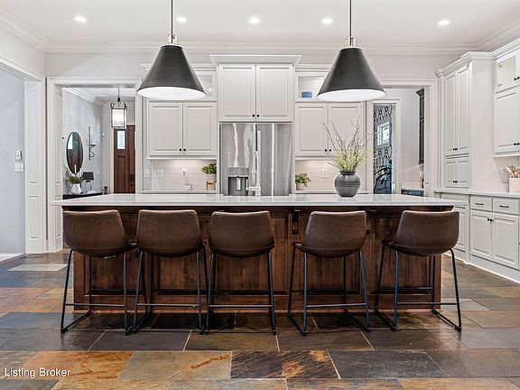 The front porch, illuminated by gas coach lights, invites tranquil evenings and delightful conversations. The grand foyer, with its slate flooring, exudes understated elegance, leading you to the formal dining room adorned with exquisite transom stained glass windows and refined wainscoting. The culinary enthusiast will be captivated by the well-appointed kitchen, boasting an updated and oversized island with upgraded countertops, double ovens, a stainless range hood, and impressive cabinetry - an ideal space for both gourmet cooking and elegant entertaining. The adjacent breakfast area features a charming window seat with views of the rear covered porch, perfect for alfresco dining and leisure. The home is equipped with installed speakers throughout the first floor and in the covered porches outside, enhancing your entertaining experience.