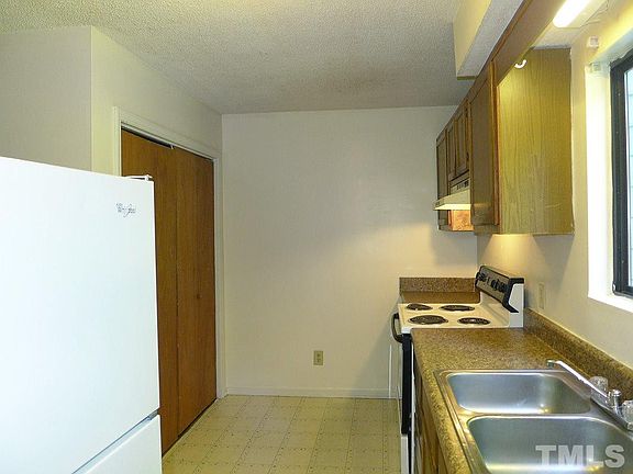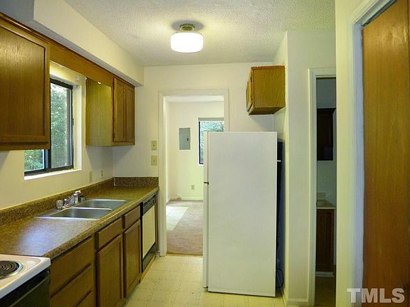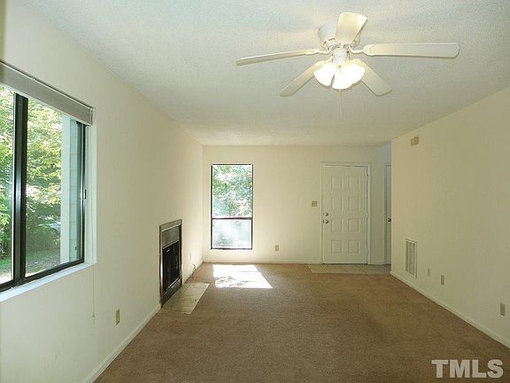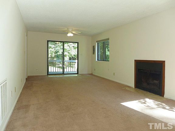 Duplex in Chapel Hill Carrboro Schools. Living and dining spaces combine, fireplace in living area, ceiling fan in dining space, carpet in this room. Slider to deck in back. Kitchen appliances include refrigerator, range, dishwasher. Laundry closet in kitchen with hook-ups. Half bathroom on main level. 1 bedroom on main, 2 up, all with carpet. Full bath up. Both bedrooms on second have ceiling fans. Storage closet on deck. Ample driveway parking. Pet with fee and prior approval. $15/mo filter fee.