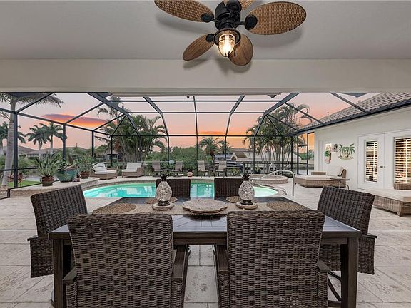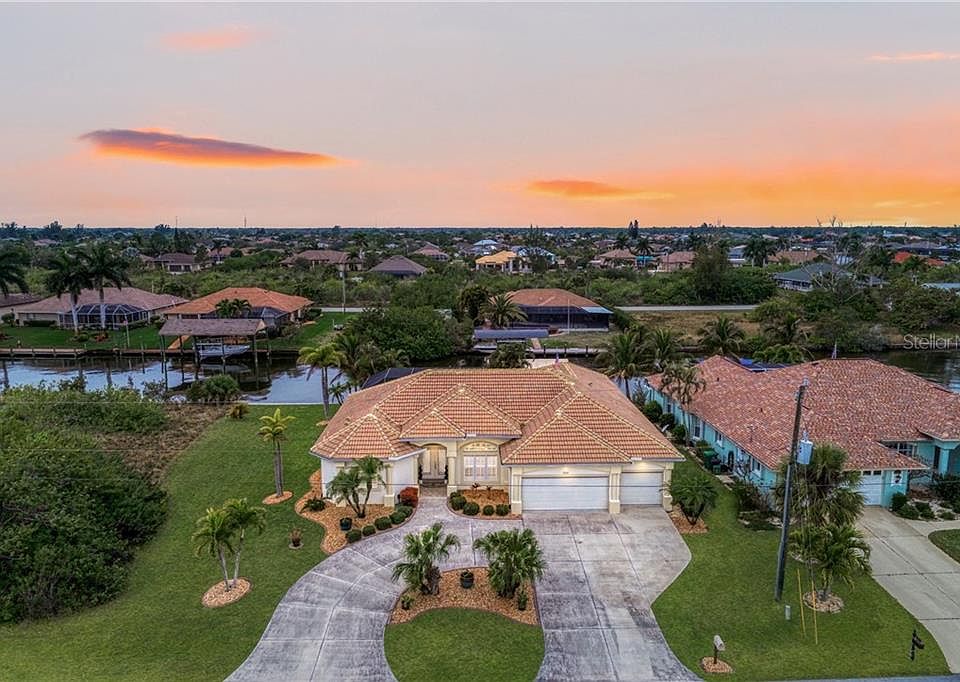 OFFER DEADLINE 2PM FEB 20TH *Be sure to click on the virtual tour & video links above. Just minutes to the lagoon and out to Charlotte Harbor by boat. Enter the front double doors and immerse yourself in luxury! This fabulously unique floor plan hosts 3 complete master suites, all with direct pool access. The spacious kitchen features granite counters with breakfast bar, elegant cabinets, massive 6x9 walk-in pantry and double oven range. You'll enter the primary master suite through the french doors and find a large walk-in closet, make-up vanity, dual bath vanity, large walk-in roman shower and soaking tub. Your guests just might get too comfortable with their own ensuites, each massive in size with luxurious baths and unparalleled privacy thanks to the incredibly functional laundry room/office (with built-in desk) separating them from the main living area. The gorgeous lanai/pool area features an elevated hot tub and large heated salt pool with in-floor cleaning system, pebble finish and two water features, just the perfect way to cool off after a day on the boat. Just steps from the lanai is your 45ft concrete dock and 12,000# covered boat lift with water & electric and dual underwater fish light system. Large circular driveway leads to the oversized 28ft wide 3-car garage with electric roll-down screens above each door. Additional features include: Tile roof, central vac, irrigation system, security alarm & lighting, plantation shutters, and additional patio area down at the water. With almost every feature imaginable, this home won't last long. Schedule your showing today! Charlotte County has installed 17+- miles of walking/bike paths throughout the community. Perfect location near beaches, shopping, dining, airports, over 200 holes of golf and world class fishing within minutes from your front door.