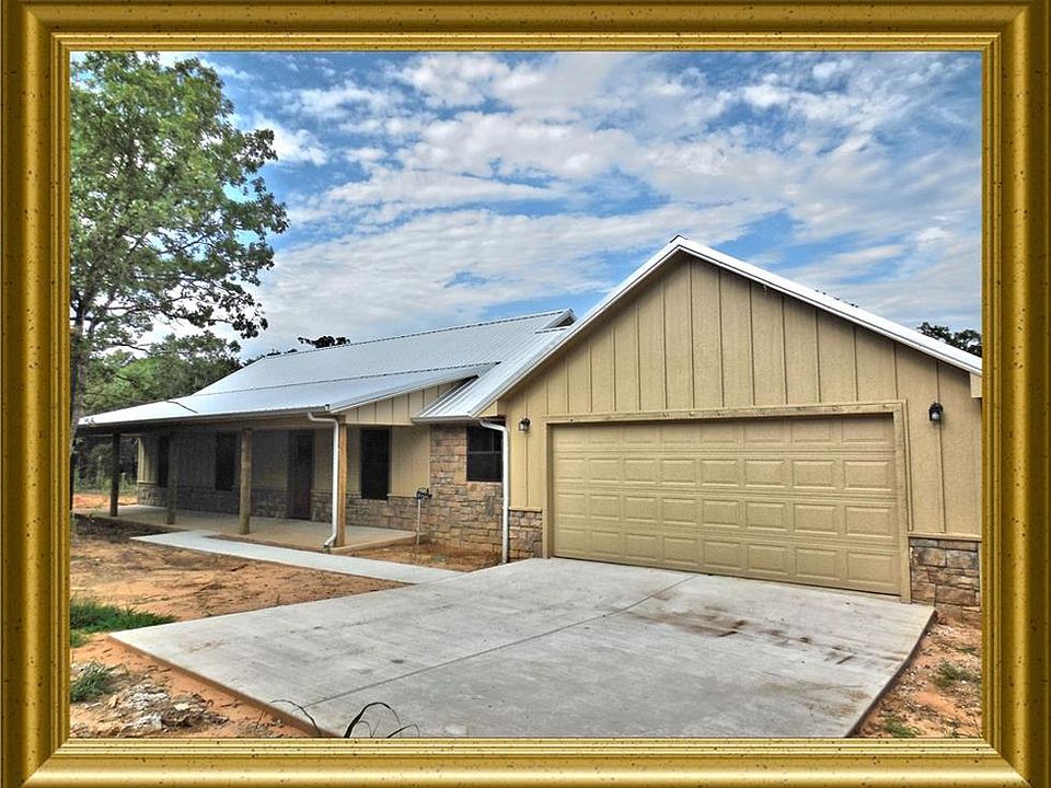This new rustic 3-bed 2-bath home is nestled among the trees on 5.97 Acres (mol). Granite in kitchen and bath; carpet and tile; fireplace. Home is styled with the latest look using rustic tin in the entry and kitchen. Solid core interior doors and oil rubbed bronze fixtures. Quality millwork in the wood trim around interior windows. Water filter system. Full guttering and insulated oversized 2-car garage. Covered front porch; metal roof with a 25 yr. limited warranty. Must see!
